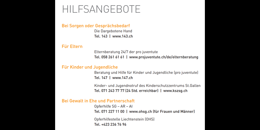 Falls Sie externe Hilfe benötigen, zögern Sie nicht, die auf dem Merkblatt aufgelisteten Organisationen unverbindlich zu kontaktieren, telefonisch oder im Internet. Sie sind dafür da und haben grosse Erfahrung. Auch die Hotline des Kantons für gesundheitliche Fragen (071 353 67 97) sowie jene der Gemeinde für praktische Fragen im Alltag (079 693 69 71) stehen Ihnen weiterhin zur Verfügung.