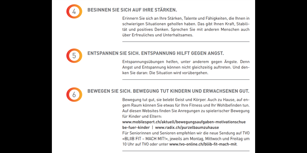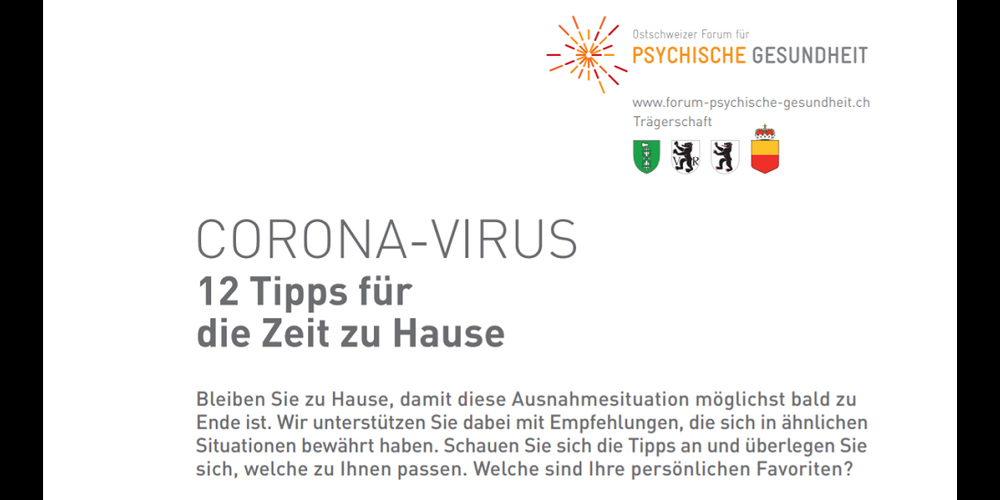 Das Ostschweizer Forum für psychische Gesundheit, getragen unter anderem vom Kanton Appenzell Ausserrhoden, hat deshalb eine Liste mit 12 Tipps erarbeitet. Sie finden diese anbei. Bitte schauen Sie die Tipps an. Diskutieren Sie sie in der Familie oder mit Nachbarn und überlegen Sie, was Ihnen in Ihrer persönlichen Lage weiterhilft.