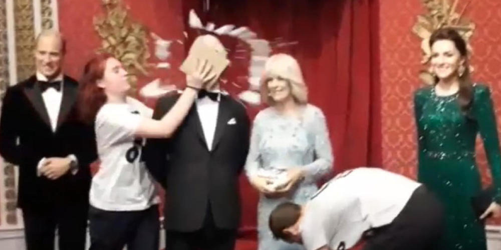 Mehrere von der Protestgruppe Just Stop Oil veröffentlichte Videos zeigen, wie sich ein Mann und eine Frau neben die Figuren der königlichen Familie stellen, ihre T-Shirts mit dem Namen der Organisation enthüllen und schliesslich das Gesicht der Wachsfigur mit jeweils einer Torte bewerfen.