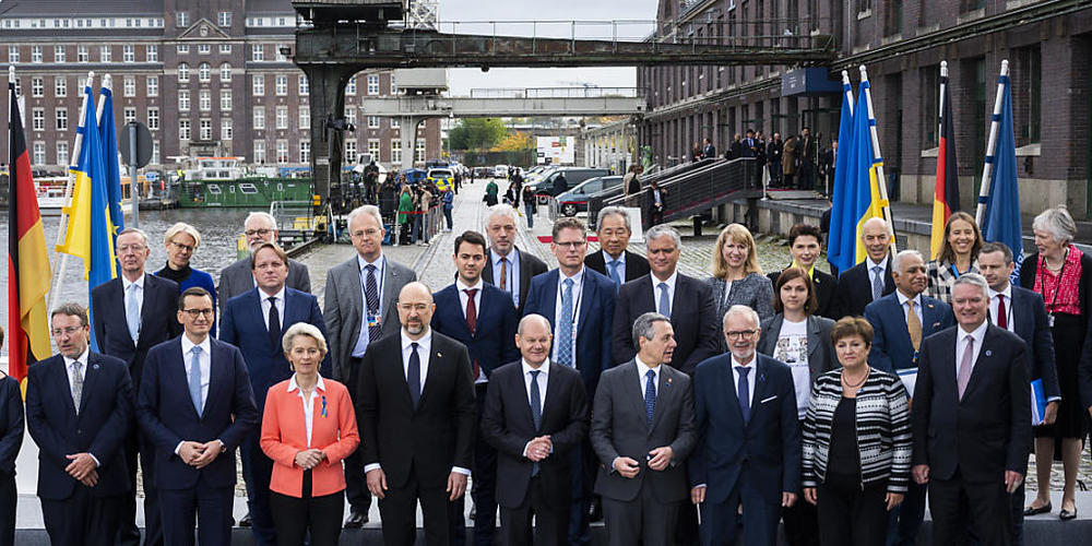 Scholz richtete die Konferenz als derzeitiger Vorsitzender der G7 zusammen mit von der Leyen aus. Der ukrainische Ministerpräsident Denys Schmyhal reiste aus Kiew an, Selenskyj wurde per Video zugeschaltet. Konkrete finanzielle Zusagen wurden bei dem Expertentreffen, das bewusst nicht als Geberkonferenz angelegt war, nicht gemacht. Der G7-Gruppe gehören neben Deutschland auch Frankreich, Italien, Japan, Kanada, die USA und Grossbritannien an.
