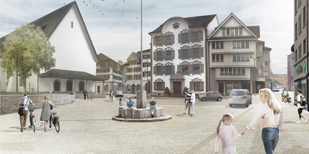 «Durch die direkte Angrenzung an die Kantonsstrasse ist die Verkehrsfläche im Bereich Obstmarkt und Platz sehr dominant», sagt Tino Buchs, Projektleiter der BBZ-Landschaftsarchitekten. «Die jetzige Topografie stellt den Verkehr in den Vordergrund.» Dies habe man im Projekt versucht abzuändern, so dass die gesamte Fläche einen Platz zum Verweilen bieten kann, auf dem man sich wohlfühlt und der wertvollen Freiraum bietet. «Dabei ist es entscheidend, den Obstmarkt und Platz als einen Gestaltungsraum anzusehen», erklärt Buchs. Das Gesamtperimeter definiere man daher um die gesamte Kirche herum.