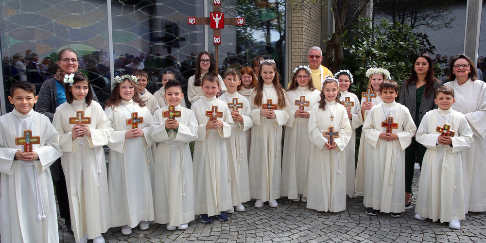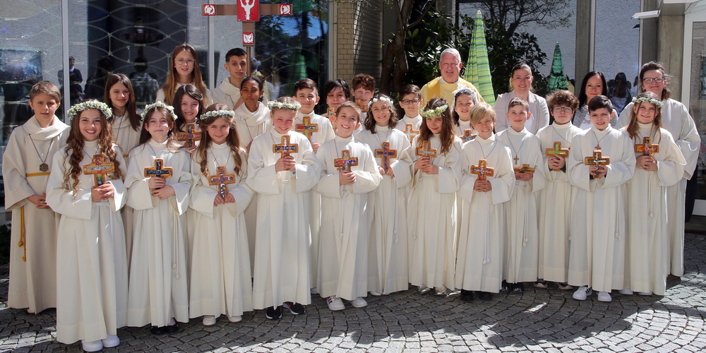 Ganz andächtig empfingen sie aus den Händen von Pfarrer Reto Oberholzer die heilige Kommunion und durften zum Schluss den wohlverdienten Applaus der Gottesdienstbesucher entgegennehmen. Sie erhielten als Andenken auch das am Familientag selbstgefertigte Glaskreuz, dieses ist nun mit einem haltgebenden Holzrahmen geschützt. Die stimmungsvolle Feier wird den Kindern wohl noch lange in Erinnerung bleiben.