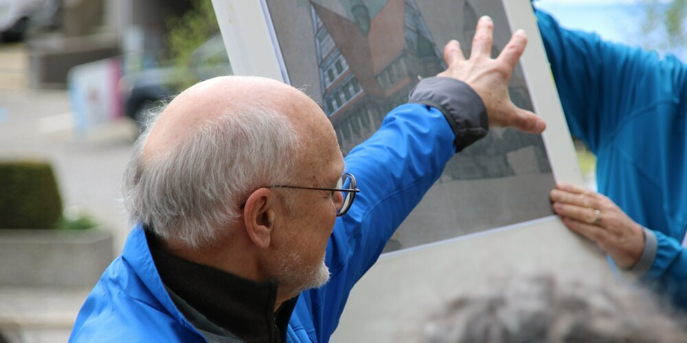 Nach dem Blick in die Zukunft mit Raumplaner Bruno Bottlang Ende April lud die Wandelbar am ersten Mai-Samstag zu einem Blick in die Vergangenheit. Dass gleich an zwei aufeinanderfolgenden Samstagen Anlässe zum Thema Platz/Obstmarkt stattfanden, ist kein Zufall. Am 9. Juni stimmen die Herisauerinnen und Herisauer über einen Kredit für die Neugestaltung und Sanierung dieser beiden Plätze ab. Die Organisatoren machten denn auch keinen Hehl daraus, dass sich die Stiftung Dorfbild – Initiantin der Wandelbar – für ein Ja zu diesem Kredit stark macht. Die möglichen zukünftigen Veränderungen waren für Historiker und Museumsleiter Thomas Fuchs kein Thema. An drei Standorten rund um die evangelische Kirche führte er die gut 50 Interessierten in die bauliche Geschichte von Platz und Obstmarkt.