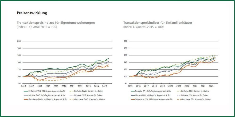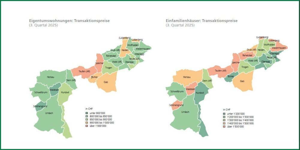 Im Verlauf der vergangenen zwölf Monate hat die Preisentwicklung bei Einfamilienhäusern in Appenzell Ausserrhoden wieder spürbar an Dynamik gewonnen. Die Transaktionspreise stiegen im 3. Quartal 2025 um 4,7 Prozent gegenüber dem Vorjahr, nachdem im Jahr 2024 noch ein leichter Rückgang verzeichnet wurde. Ein neuwertiges Einfamilienhaus mittlerer Grösse kostet inzwischen rund 1,5 Millionen Franken. Die Preise für Eigentumswohnungen setzten ihren dynamischen Aufwärtstrend fort und stiegen gegenüber dem Vorjahresquartal um 4,2 Prozent.