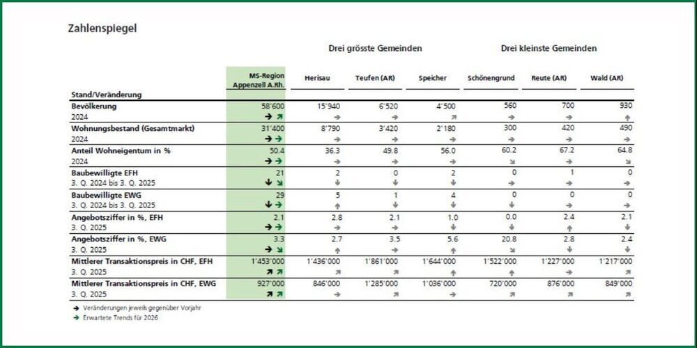 Die Auswahl an Eigentumswohnungen bleibt in Appenzell Ausserrhoden weiterhin limitiert. Im 3. Quartal 2025 standen lediglich 3,3 Prozent des Bestands zum Verkauf – deutlich weniger als der schweizweite Durchschnitt von 4,1 Prozent. Auch von der Bautätigkeit sind kaum Impulse zu erwarten: In den vergangenen zwölf Monaten wurden nur rund 30 Eigentumswohnungen bewilligt, gegenüber etwa 70 Einheiten im Vorjahr. Der Markt für Einfamilienhäuser zeigt sich ebenfalls knapp; die Angebotsziffer lag im 3. Quartal 2025 bei lediglich 2,1 Prozent.