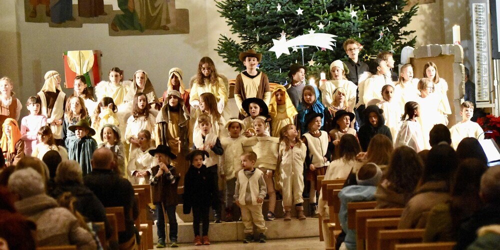 «Es freut uns sehr, dass jedes Mal mehr Kinder mitmachen. Vielleicht erreichen wir in einem Jahr die Marke von 50», meinte Seelsorgerin Beatrix Baur-Fuchs. Sie war mit unterstützenden Personen aus der Pfarrei für den Gottesdienst und das Krippenspiel verantwortlich. Die Knaben und Mädchen (die jüngsten im Kindergartenalter) hatten seit Ende November einmal pro Woche geprobt. Sie strahlten beim Singen, Spielen und Musizieren grosse Begeisterung aus und waren mit bemerkenswerter Konzentration im Einsatz. Sehr viele Angehörige hatten sich am frühen Abend in der Kirche eingefunden. Das Erstaunen war gross, dass sogar das Jesuskind von einem Menschen gespielt wurde. (pd)