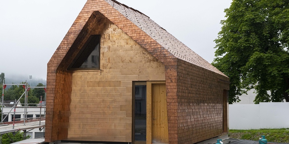 Schon bald wird der Glanz der Schindeln einer Patina weichen, die dem Gebäude einen dem Ort entsprechenden, würdigen Charakter verleihen wird. Dabei unterstützt das "Schindelkleid" das aus dem vieleckigen Grundriss entstehende Volumen. Dadurch erhält das Nebengebäude einen eigenständigen Charakter, ohne dabei die umliegenden Bauten zu konkurrenzieren. Es bietet künftig Platz für eine breite Vielfalt kleinerer Veranstaltungen.
